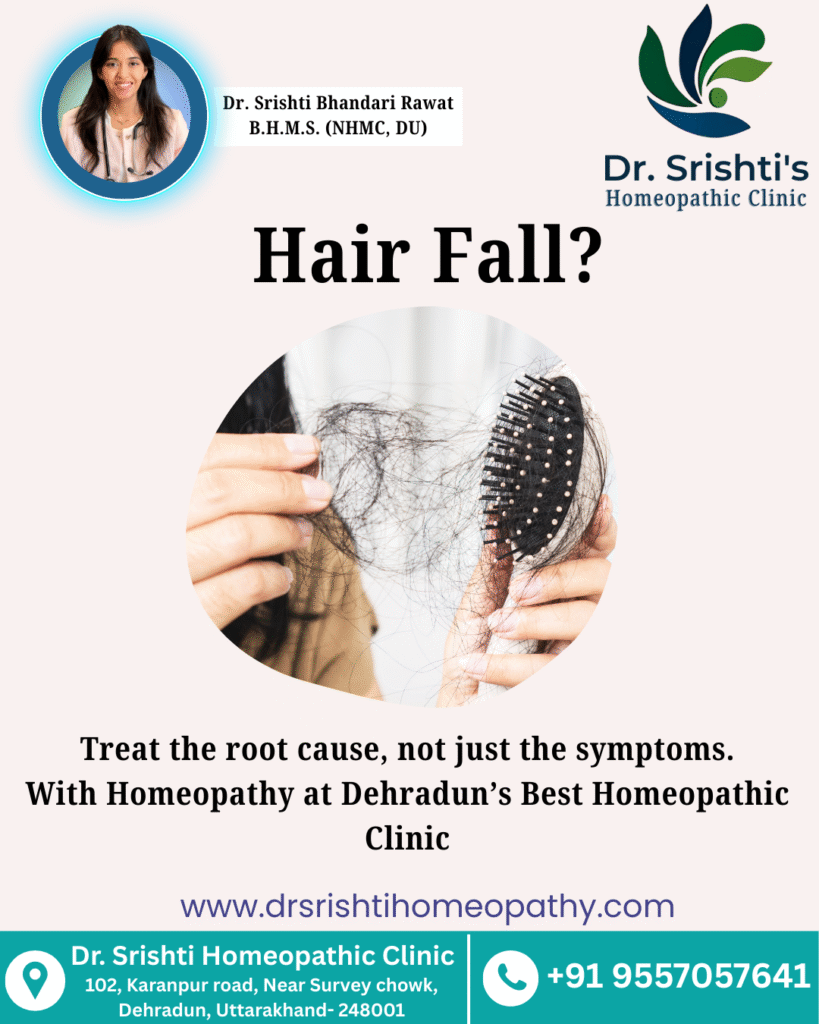 Dr Srishti Homeopathic Clinic- Homeopathic treatment for hair fall in Dehradun addresses underlying causes for lasting results. Hair problems often reflect internal health issues – comprehensive treatment gives better, lasting results.